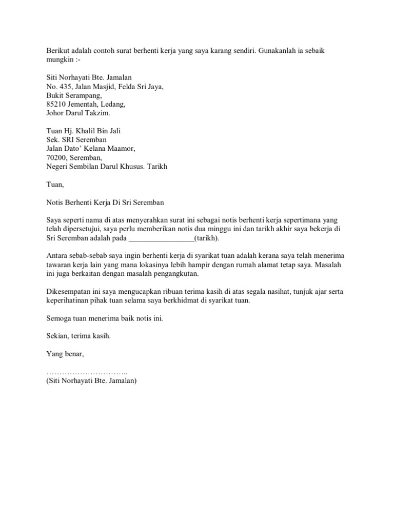 Berhenti kerja sebab kahwin. Ini pula contoh surat berhenti kerja sebulan dalam bahasa melayu. Dalam surat tersebut Kes ini diselesaikan pada hari ini dengan kehadiran Plaintif secara bersendirian dan Defenden tidak hadir.